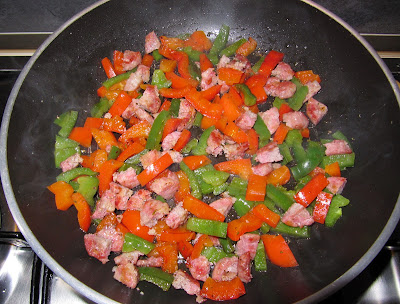 Dopo 15 minuti togliete dal fuoco la salsiccia, la tagliate a piccoli pezzi, la unite ai peperoni e continuate la cottura per 10 minuti.