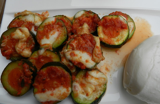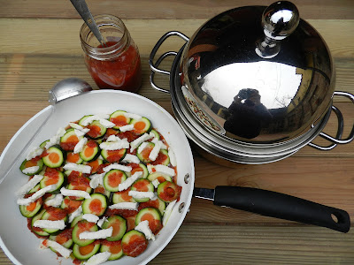 Poi ungete una padella, versate la passata, disponete sopra le rotelle di zucchina e strisce di mozzarella.