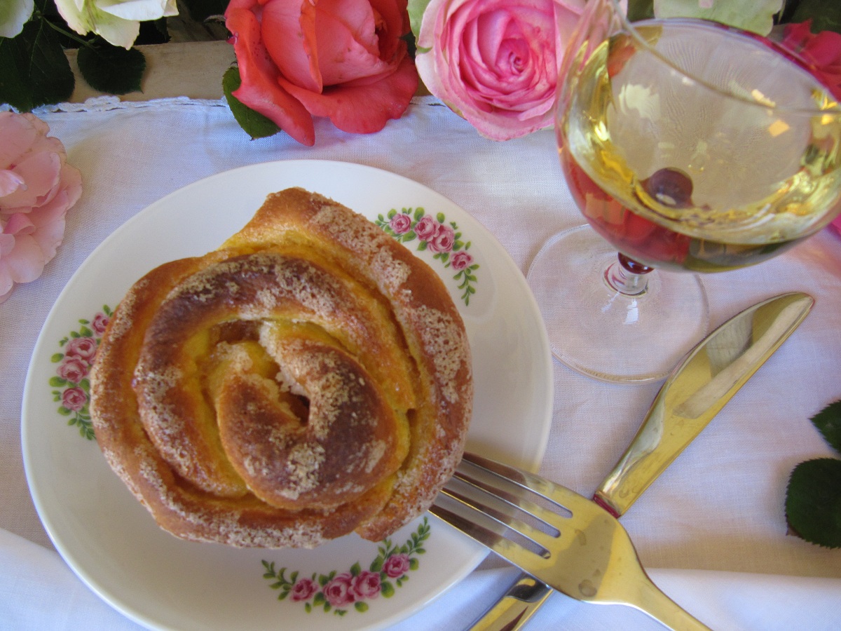 Dividete la pasta in 7-8 pezzi, formate dei cerchi di circa 15 cm di diametro, tagliate la corona in 4 parti uguali, spalmate la superficie con la marmellata e attorcigliate i “petali” su se stessi, formando delle “rose”, infine spalmate un po’ di crema sulla loro superficie.