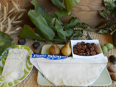 Tritate grossolanamente le noci e tagliate a cubetti il gorgonzola, mettete la sfoglia in una teglia, spargetevi sopra le noci tritate, il grana, le fette di pera che avrete scolato e i cubetti di gorgonzola