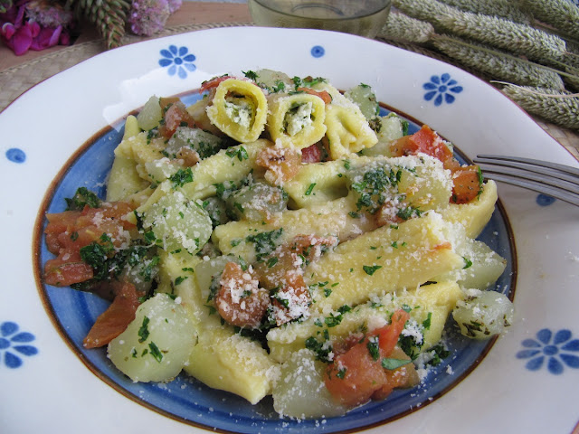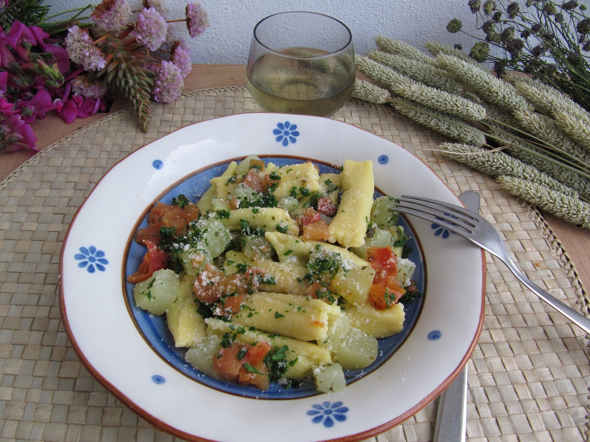 Un primo piatto gradevole e inconsueto. Nel ripieno il sapore amaro della rucola è smorzato dal gusto delicato della ricotta. L’aroma penetrante dei pinoli ed il saporito grana lo completano egregiamente. Il condimento coi suoi pomodori dolci e leggermente aciduli, la patata dal gusto delicato e il prezzemolo leggermente piccante, ben si accompagna a questa pasta ripiena dal gusto amarognolo.