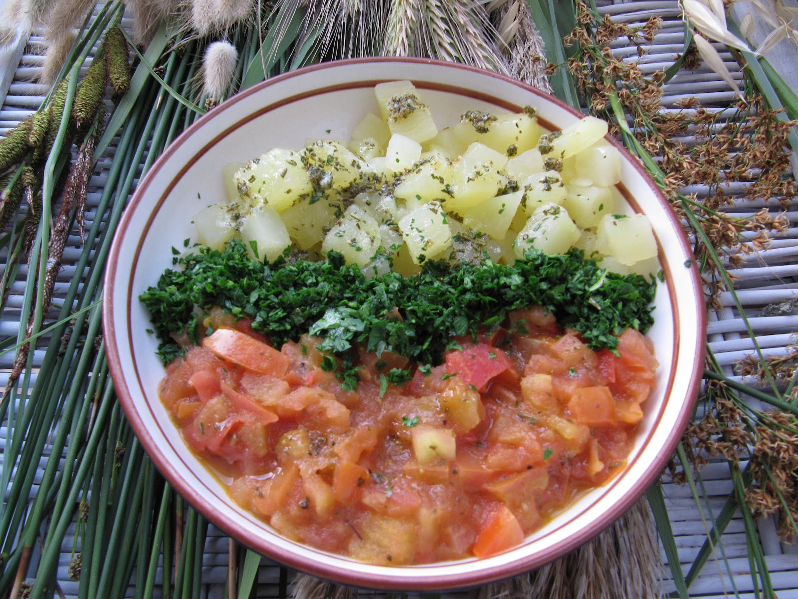 Tagliate la patata a dadini e la fate cuocere in un pentolino pieno d’acqua per 6-7 minuti. Tagliate i pomodori allo stesso modo e li fate cuocere in una padella unta d’olio per 5 minuti. Fate soffriggere il rosmarino triturato ( o la salvia se preferite ) nel burro per 3-4 minuti. Tritate finemente il prezzemolo ed infine unite tutto insieme in una ciotola.