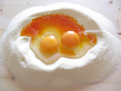 Disponete la farina a fontana sulla spianatoia, mettete lo zafferano sciolto in poca acqua e le uova nel mezzo, salate.