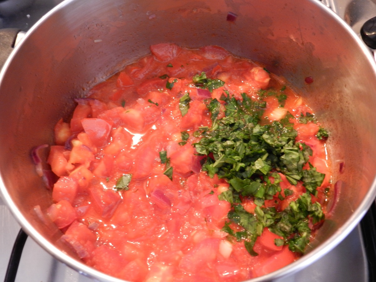 Dopo 5 minuti aggiungete il basilico tritato grossolanamente, fate cuocere per 15 minuti aggiustando di sale e pepe