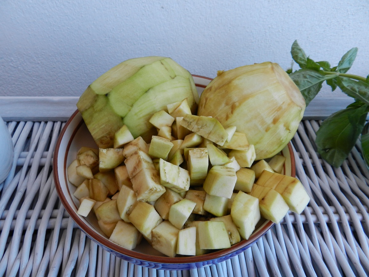 Con un coltello ben affilato togliete la buccia alle melanzane, tagliatele a cubetti di 1 cm di lato, mettetele in una zuppiera salatele abbondantemente e lasciatele coperte per 40/45 minuti.