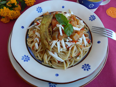 Se volete fate grigliare qualche fettina di melanzana, le passate in olio, limone e sale e le usate per decorare il piatto. In una pentola con l’acqua in ebollizione fate cuocere gli spaghetti per circa 8 minuti, preparate grattugiata la ricotta salata