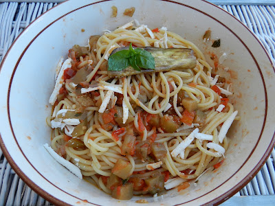 Scolate la pasta, versatela in una zuppiera, aggiungete il sugo, la ricotta grattugiata e rigirate per condire bene. Decorate con fettine di melanzana grigliate e qualche fogliolina di basilico.