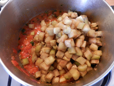 Lavate bene le melanzane, avendo cura di togliere tutto il sale, le unite ai pomodori e fate cuocere tutto per 30 minuti circa aggiungendo se necessario un po’ d’acqua.