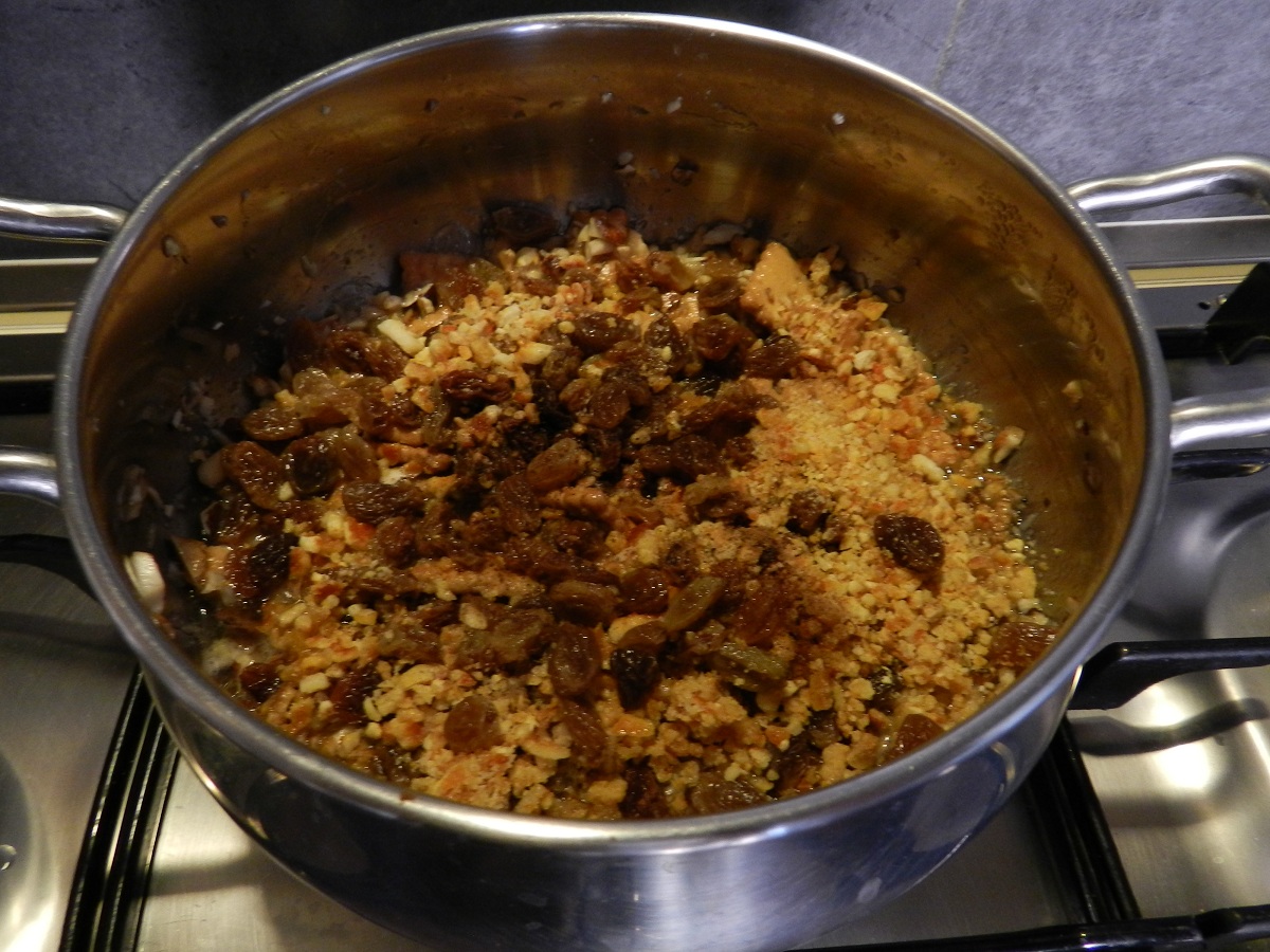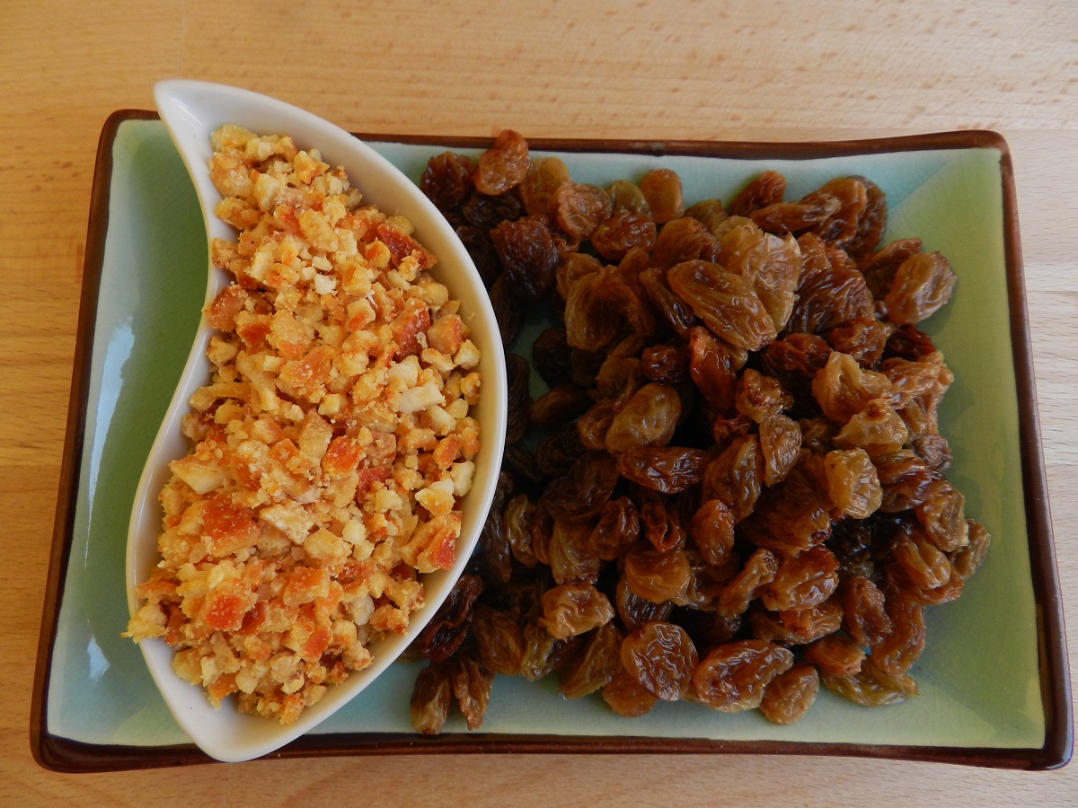 Mettete l’uva sultanina in ammollo in una tazza d’acqua per mezz’ora e frullate un poco i canditi.