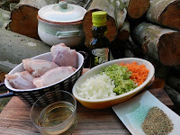 Tritate le verdure, poi in una casseruola fate appassire le cipolle in un po’ d’olio d’oliva, aggiungete il pollo, il sale, gli aromi, per ultimo il vino e quando è evaporato unite il trito di sedano e carote e rigirate i pezzi di carne.