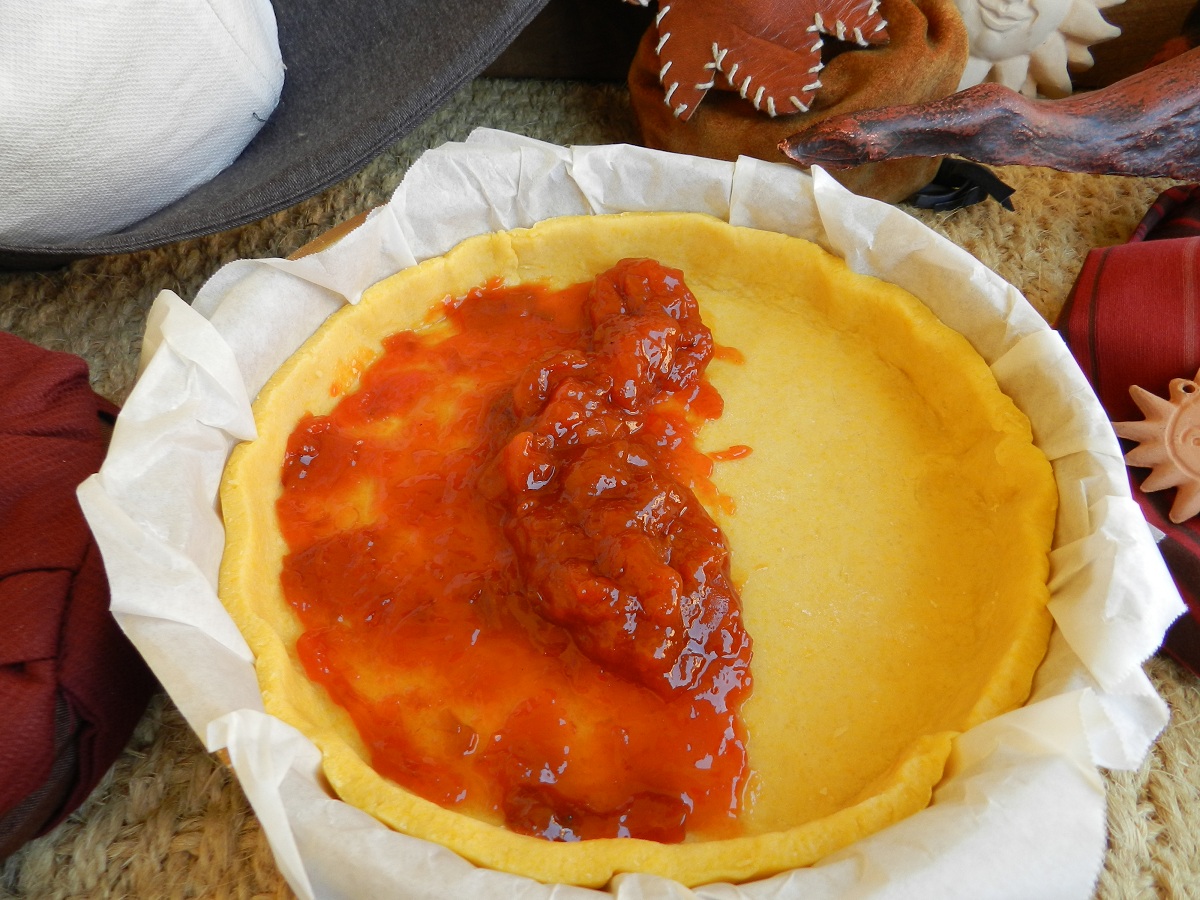 la ritagliate del diametro di 28-30 cm e la mettete in una teglia ricoperta di carta forno. Spalmate sulla superficie la marmellata di albicocche