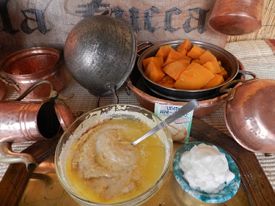 lessate la zucca, frullate gli amaretti, montate a neve ben soda l’albume. In una grossa ciotola sbattete i tuorli con lo zucchero,
