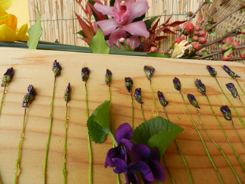 In una piccola padella fate sciogliere un po’ di zucchero a fuoco moderato, intingete le violette appena raccolte per qualche secondo e conservate in frigorifero sino all’utilizzo, che deve avvenire entro pochi giorni dalla preparazione.