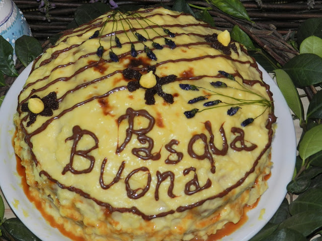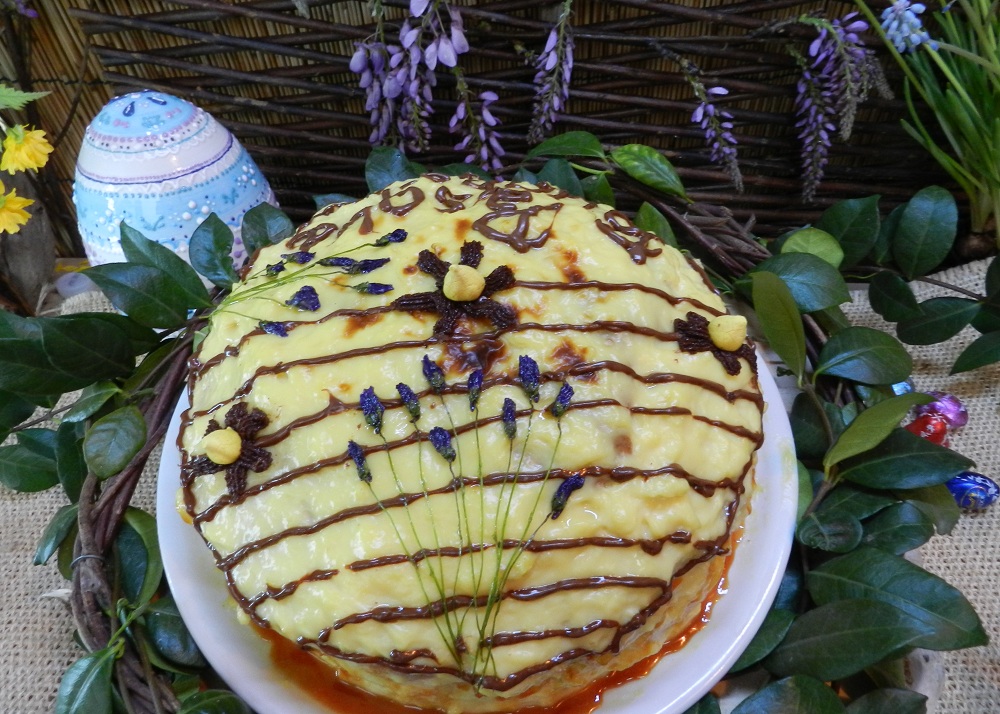 Questa torta non è molto impegnativa ed è buona. Il tempo che impiegherete dipenderà poi dalla decorazione che deciderete di fare. Noi l’abbiamo ricoperta di crema pasticcera e decorata con la crema di farcitura, piccole meringhe e violette caramellate.