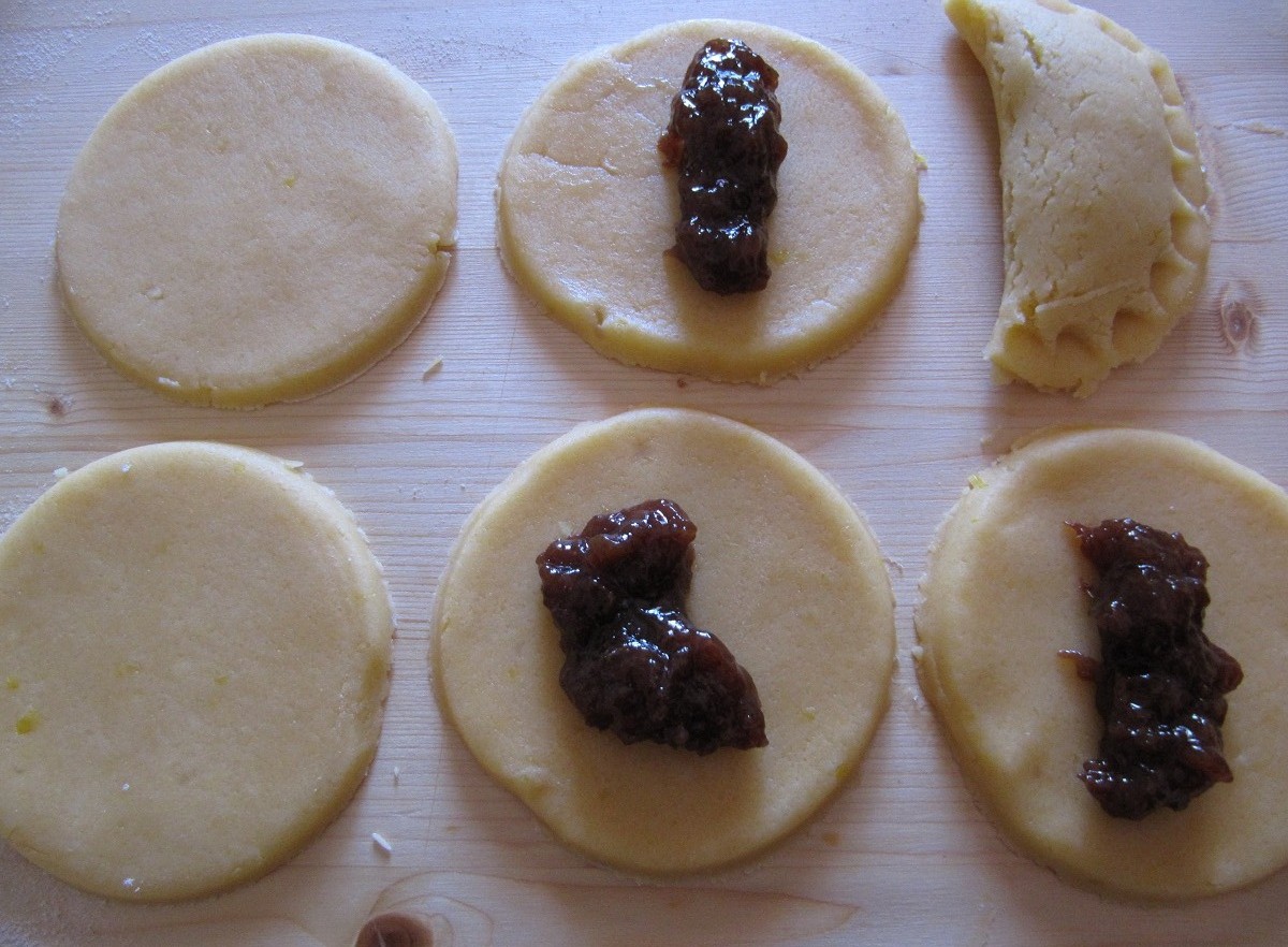 mettete nel mezzo un cucchiaino di marmellata, ripiegate la pasta su se stessa e premete i bordi con i rebbi di una forchetta o il manico di un cucchiaino.