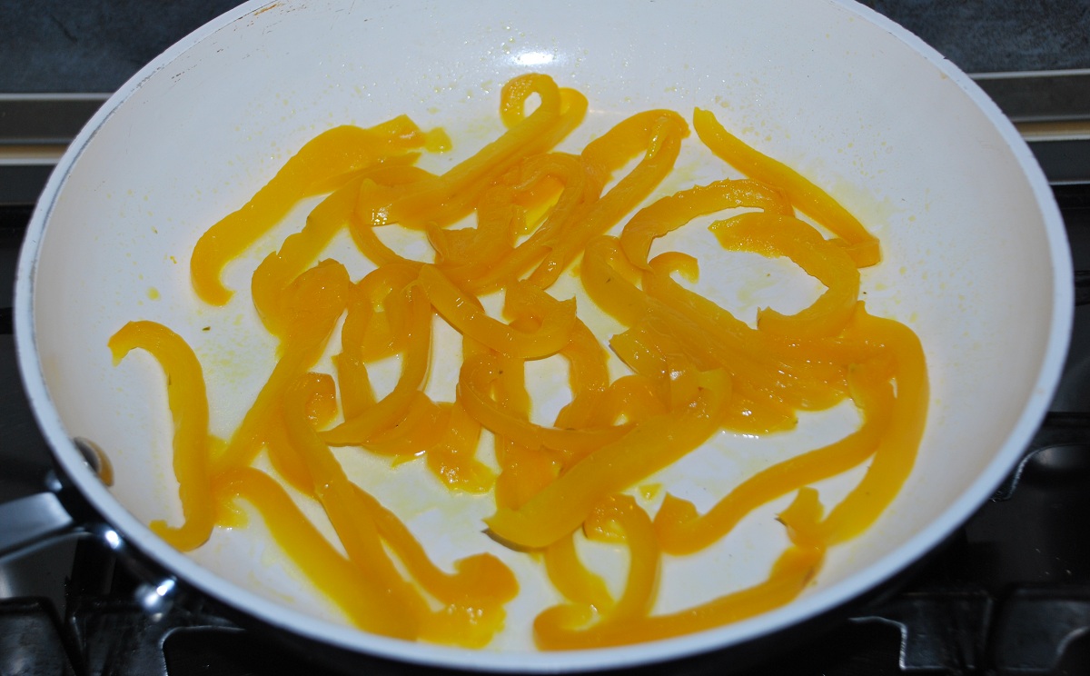 Tagliate il peperone a listarelle e lo fate cuocere in una padella con un po’ d’olio, acqua e sale.