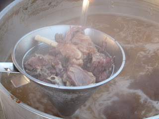 In una pentola si prepara il brodo con carote, sedano, cipolla, 70% carne di pecora (300gr) e 30% carne di manzo (90gr). Si mette in una pentola e si fa bollire per 2-3 ore.